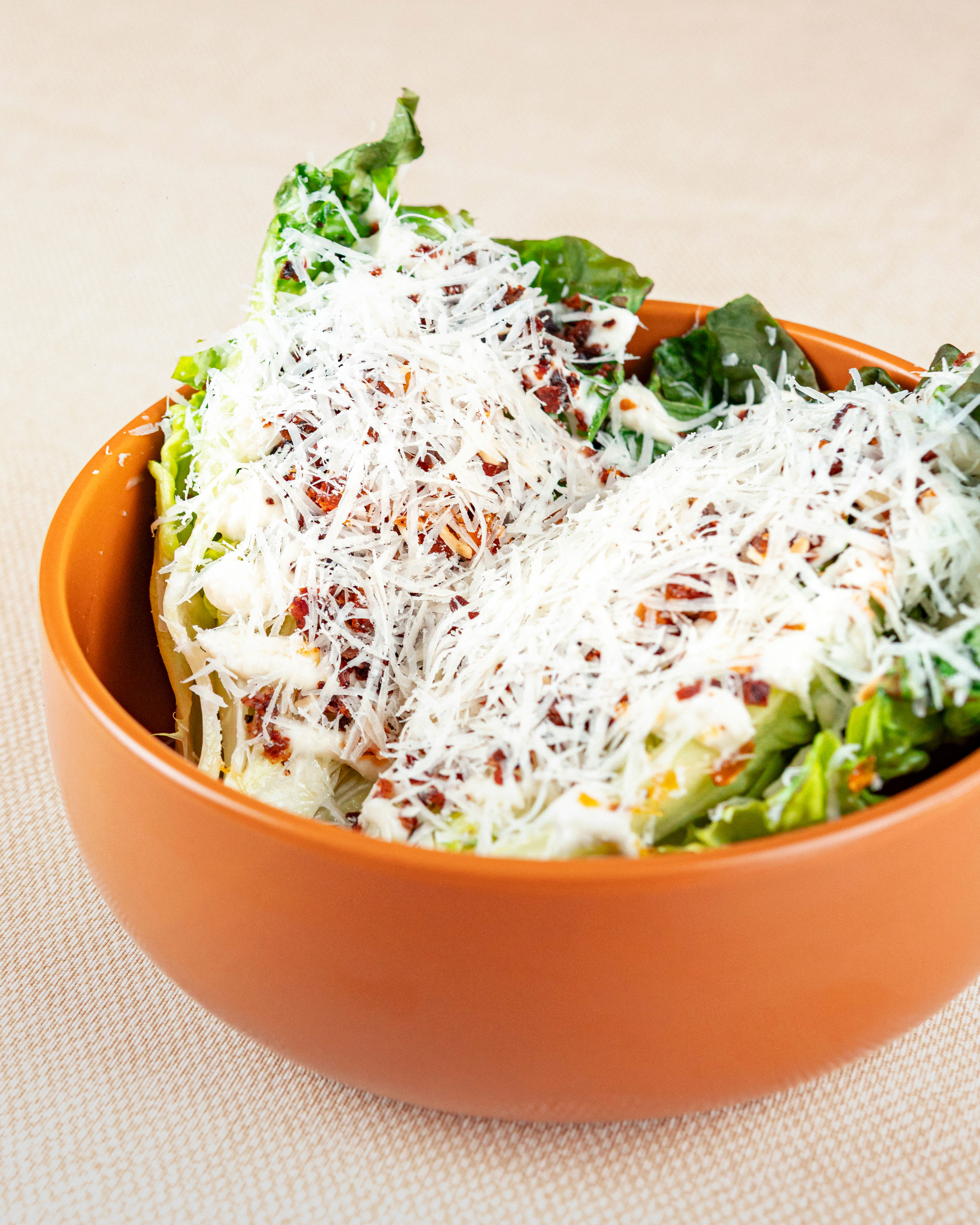 Ensalada de cogollos europeos a la parrilla con salsa alioli, tocineta crocante, praliné de nueces y queso grana padano