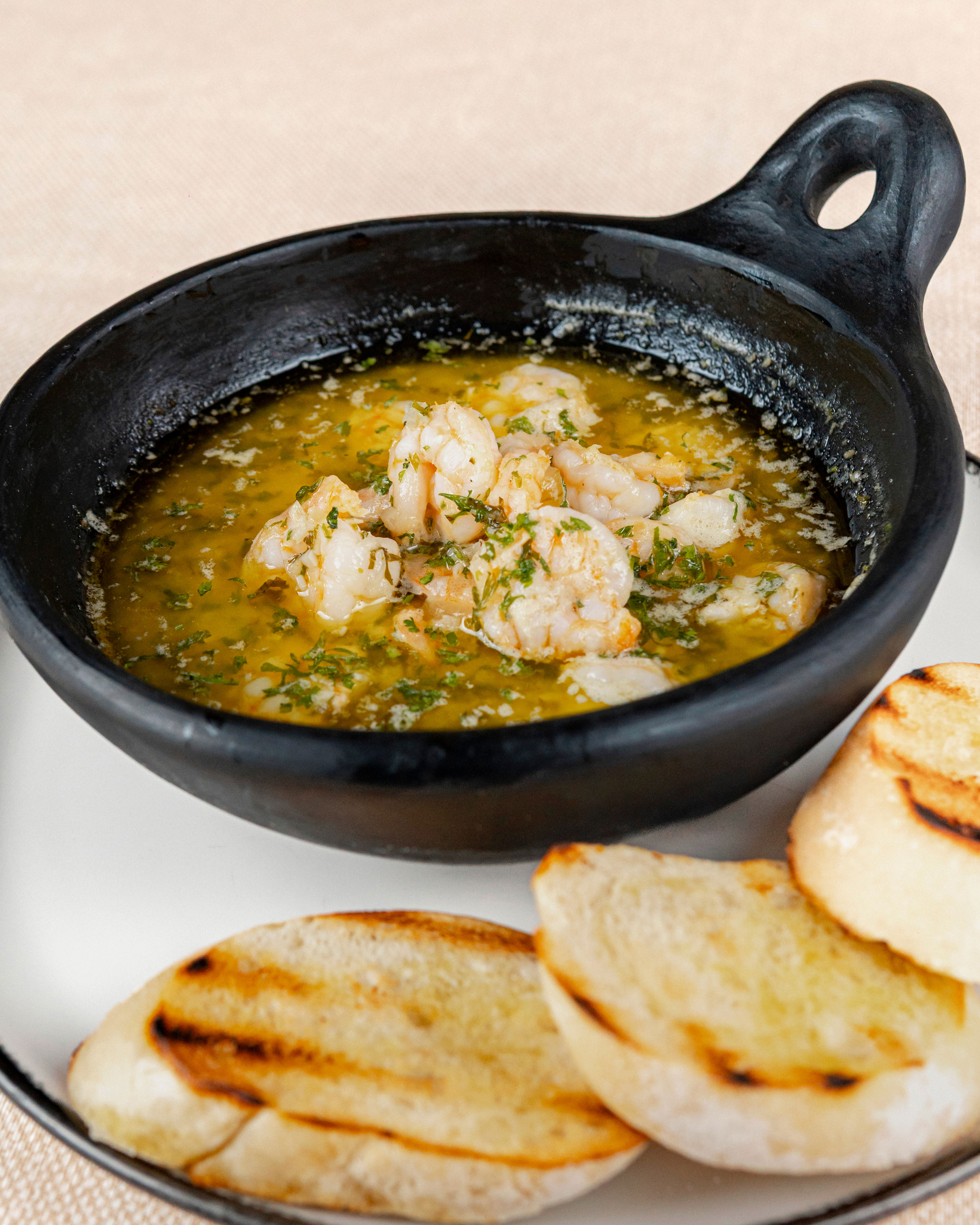Camarones en salsa al ajo, vino y aceite de oliva.