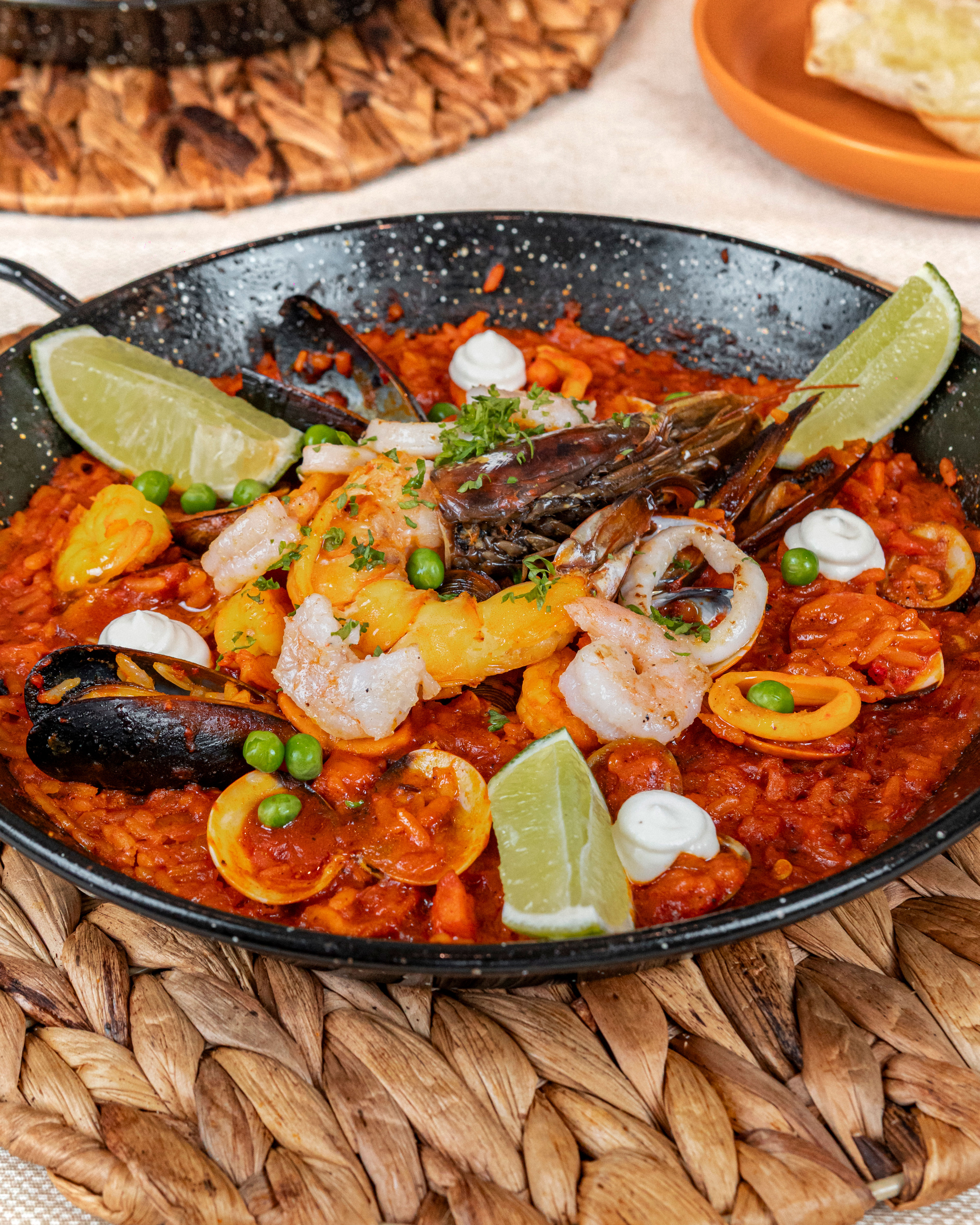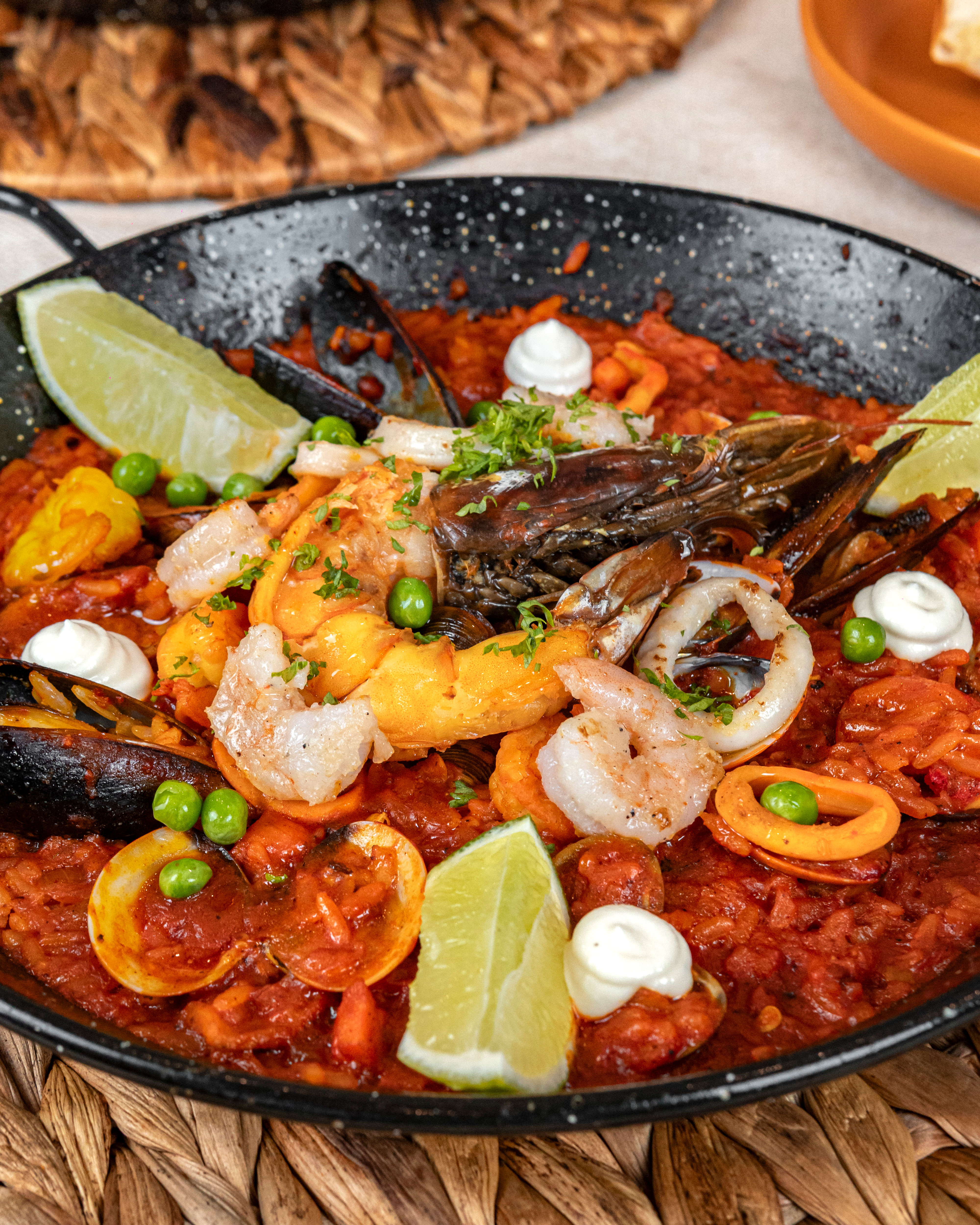 Tradicional paella de mariscos, con el inconfundible sabor del mar y el toque especial de la casa.