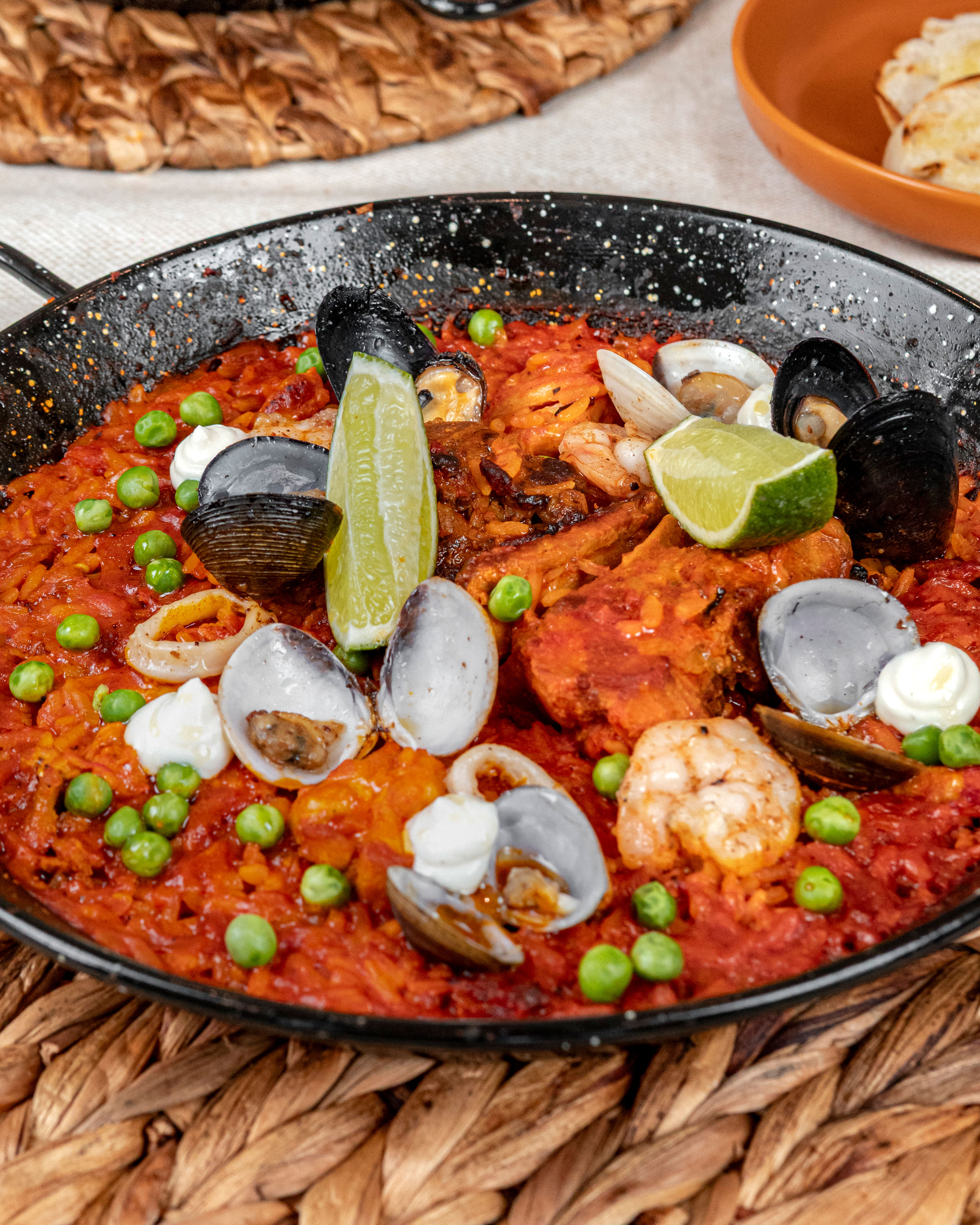 Versión mixta de nuestra paella, combinando lo mejor del mar y la tierra en un solo plato lleno de sabor.
