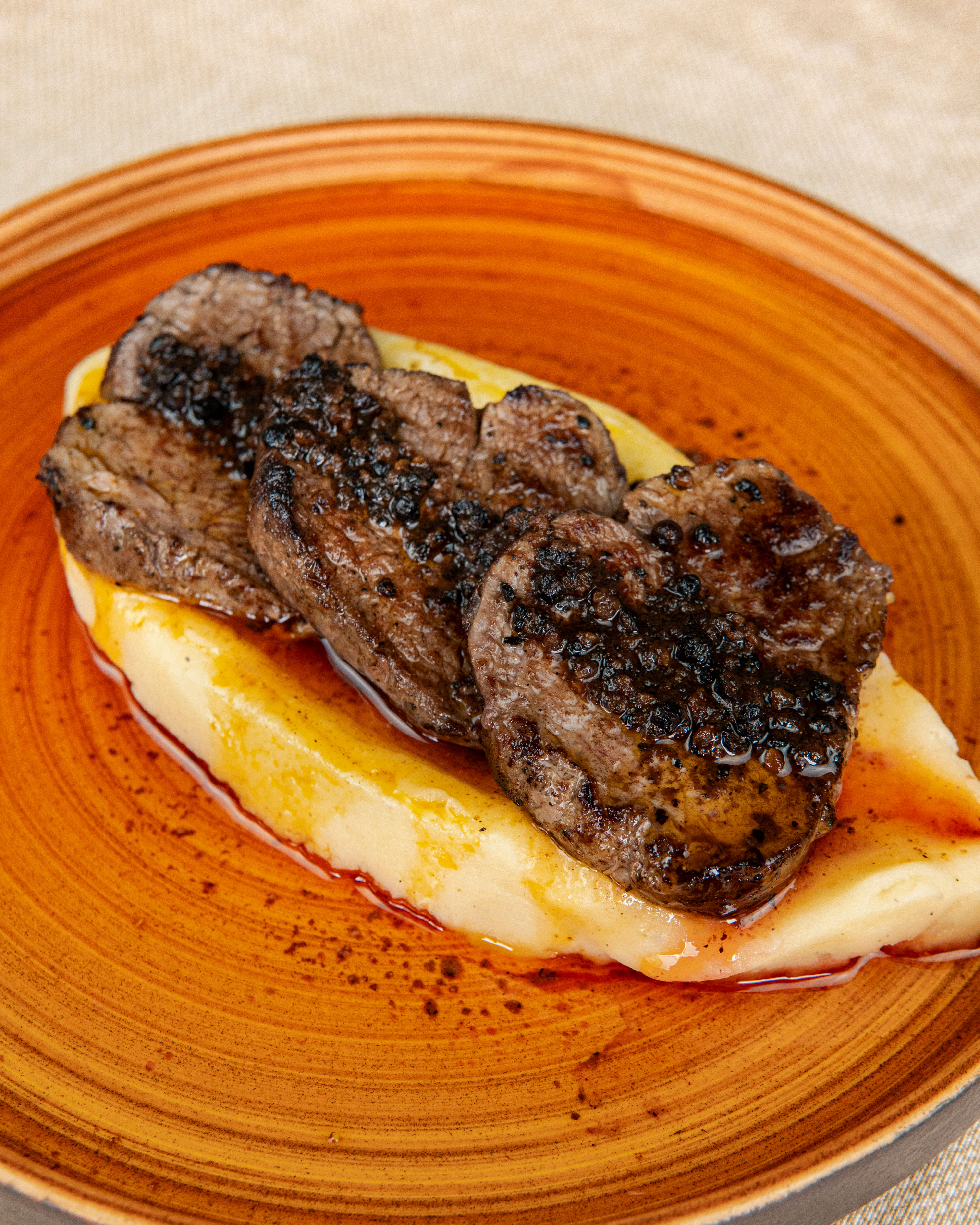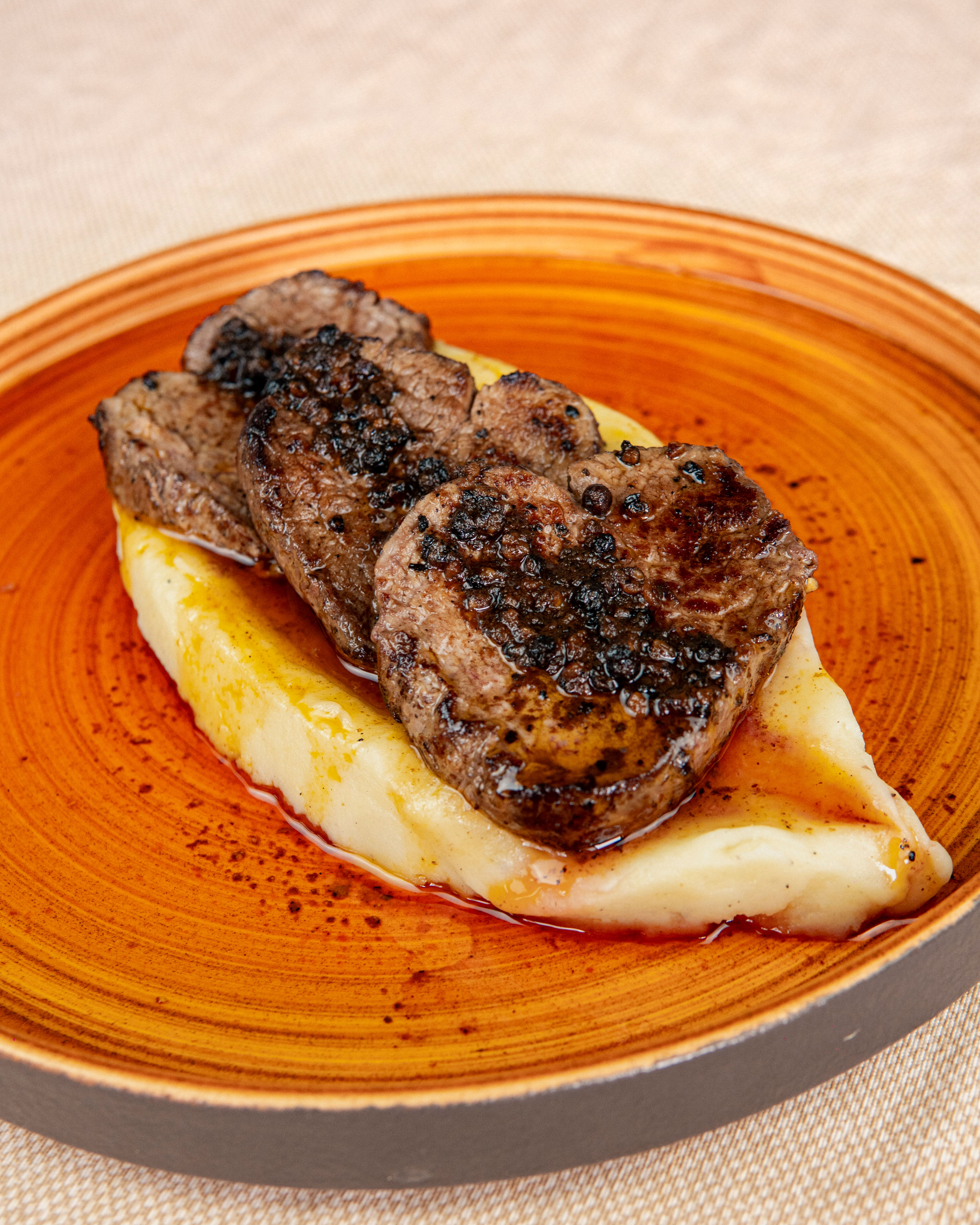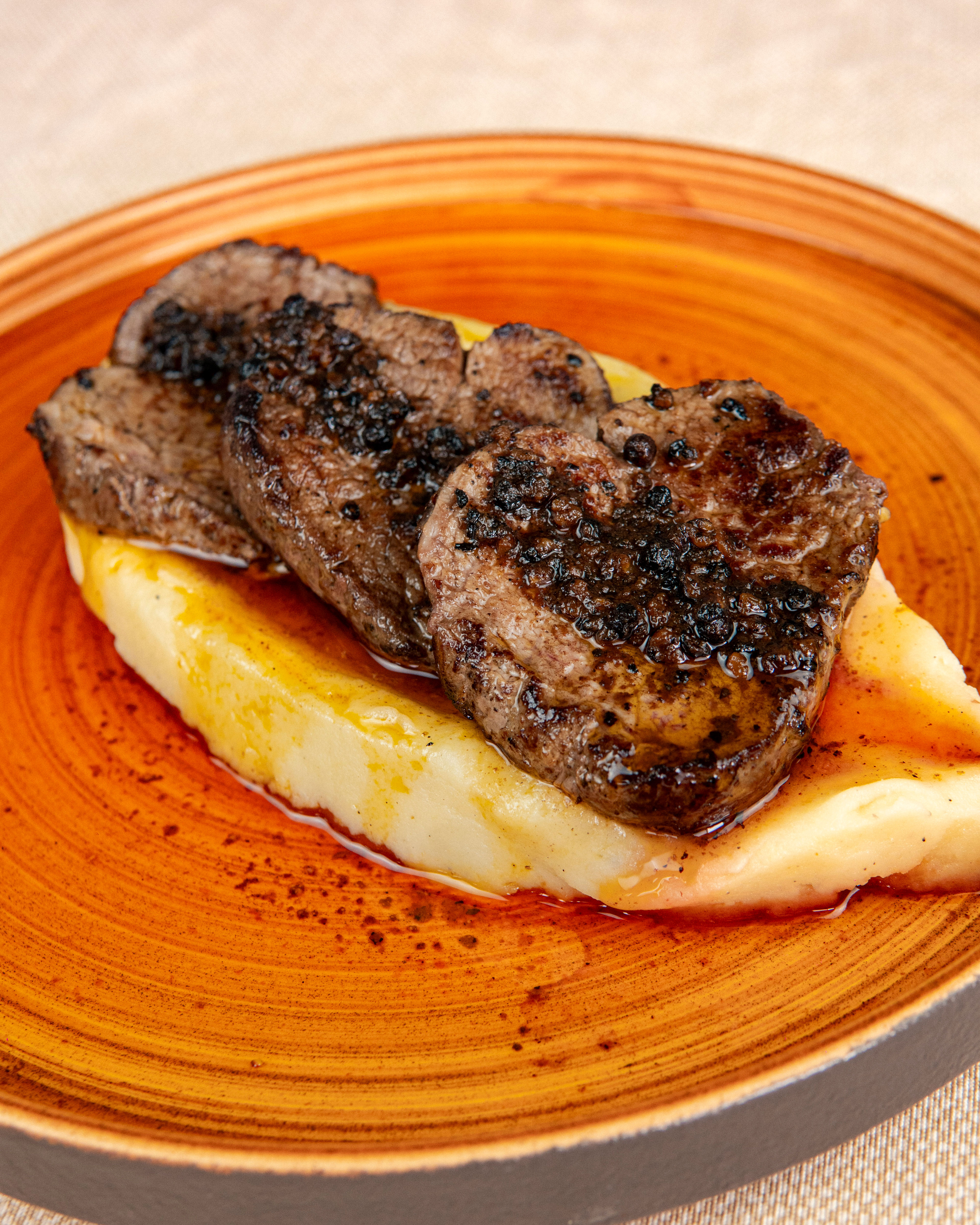 Lomo fino de res a la parrilla con salsa de pimienta tostada y mantequilla noissete. Acompañado con puré de papas o papas fritas